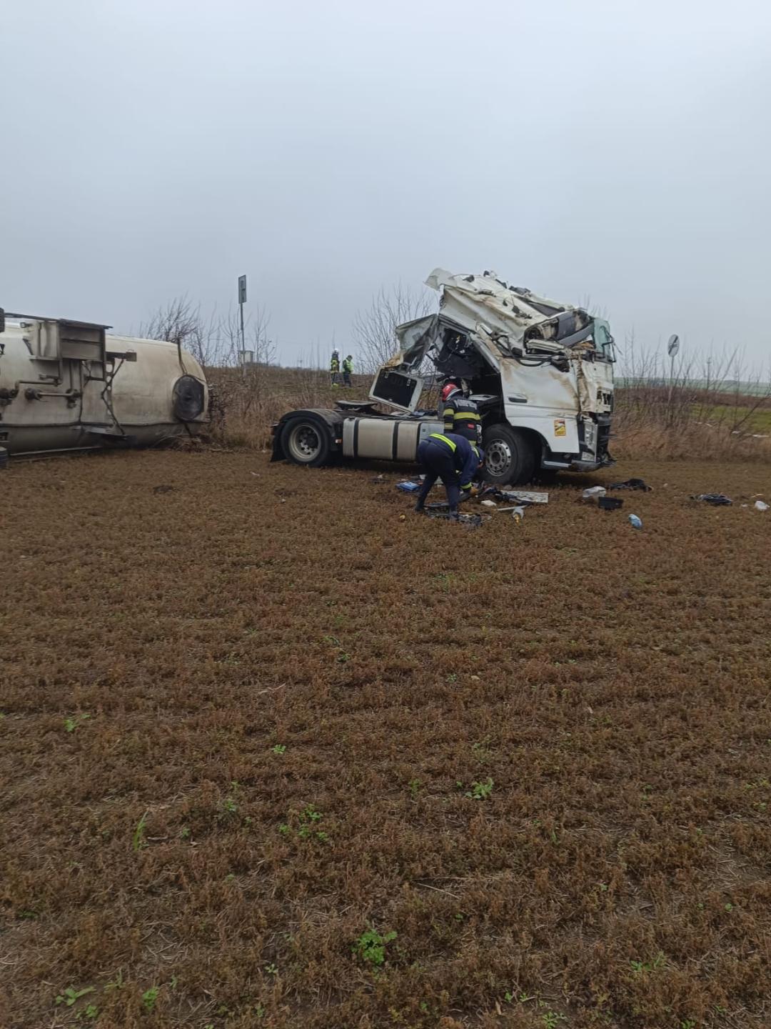 Pompierii acționează pentru repunerea pe roți a unui autocamion răsturnat pe E81 lângă Topa Mică