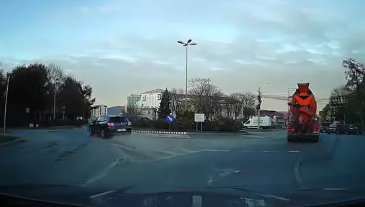 După doar câteva secunde, șoferul nerăbdător a decis să depășească betoniera prin sensul giratoriu, însă a ales să ocolească pe contrasens, pe partea stângă a rondoului. Această manevră riscantă putea provoca accidente grave cu alte autoturisme sau bicicliști din zonă.